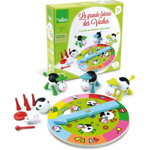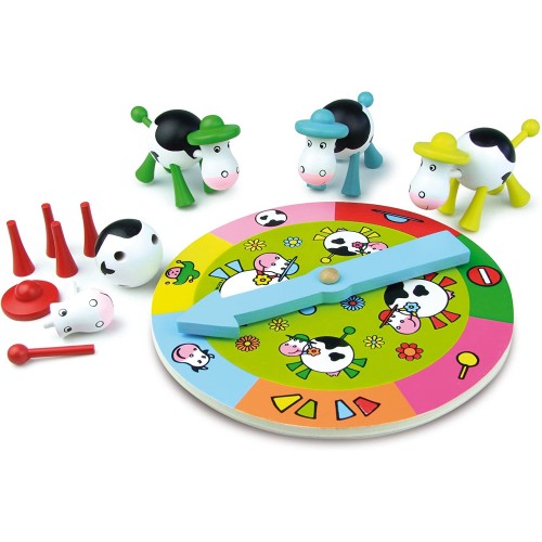 Wooden game with thirty-three pieces to build cows using the picture wheel. The first to build a cow has won! Rule book in several languages included.