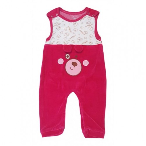 Comfortable plush jumpsuit without sleeves. Funny textile appliqué with ears on the front.