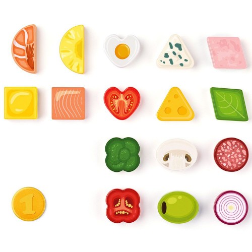 - The packaging and the bottom of the pizza are made of cardboard, the other elements are made of wood and plastic