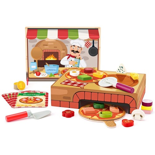 - The set includes 38 elements: a package made of reinforced cardboard that is also an oven 5 menu cards a knife for cutting pizza a pizza spatula a pizza board 8 triangular pieces of pizza 8 coins with a face value of "1" cardboard with the image of carlo and pizzeria / on the reverse a signpost "Pizza -->" 2 stands for cardboard as a background 16 wooden ingredients, e.g. onion, tomato, cheese, etc. Dimensions of the packaging / pizza oven: 29 x 22 x 7.5 cm