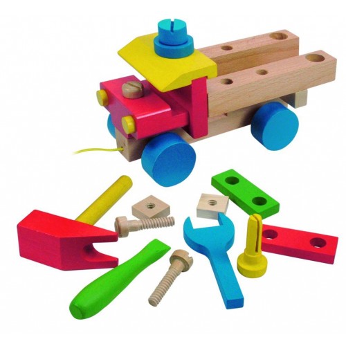 - Woody's wooden tool construction tool truck contains 17 parts: a wooden truck, 4 screws with nuts, 2 nails, 2 boards, a screwdriver, a hammer and a wrench