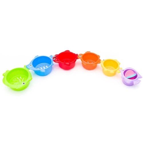 Комплект от 6 чашки, всяка от тях е във формата на различно животно и има различни отвори, за изтичане на водата по различен начин. Чашките за игра Fillikid могат да се закачат една за друга.