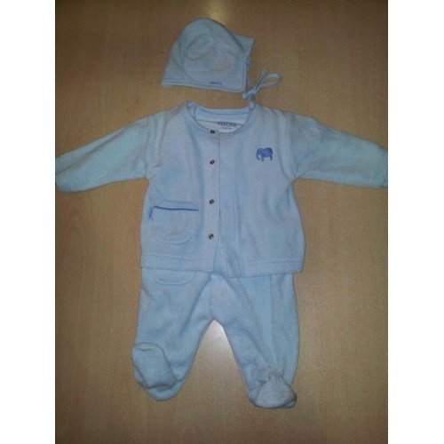 - Комплектът съдържа боди с дълъг ръкав, гащеризон без ръкав (плюш), жилетка (плюш) и шапчица.