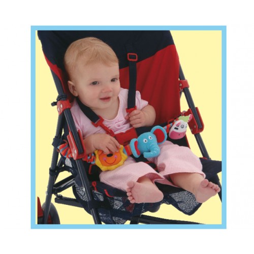 Дрънкалката за количка “Животни” ще занимава вашия Мъник по време на разходките. Играчката има три меки животинчета - лъвче (дрънкалка), шумящо слонче и зебра, която издава "писукащ" звук. Играчката лесно може да се захване към количка или столче за кола с велкро лепенки.