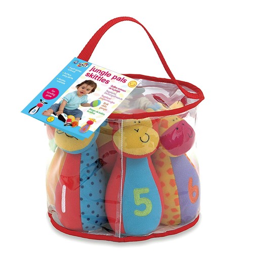 Комплектът кегли "Джунгла" на Galt се състои от 6 меки текстилни кегли под формата на различни животни в ярки цветове и 1 мека топка.