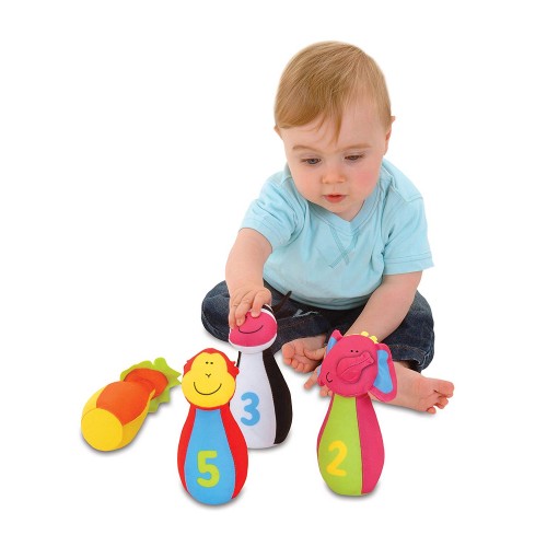 В топката има скрита камбанка, а куклите животни издават "дрънкащ" звук. На коремчето на всяко едно от шестте животни - кегли има нарисуван по един номер, което помага на детето да научи цифрите по- лесно. Детският кегелбан на "Galt" осигурява забавна и образователна игра с кегли на бебето, чрез която да прецизира движенията си.