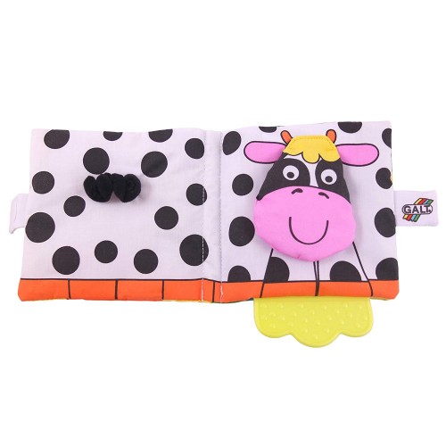 Меката книжка с гризалка "Ферма" на Galt съдържа 8 цветни и шумящи страници с различни активности.