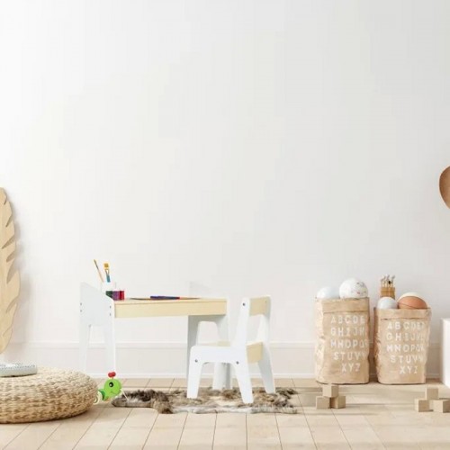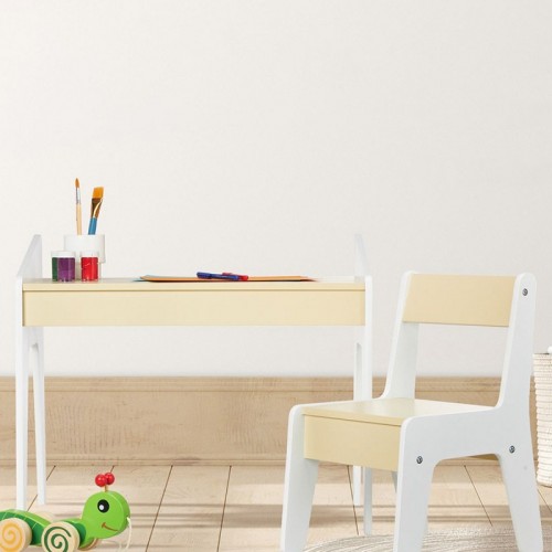 Комплектът e с размер, подходящ за деца и осигурява комфортна позиция за учене. Столът е с опора за гърба, за постигне оптимално положение при седене, а плотът има лек наклон. Всички ъгли и ръбове са заоблени за максимална сигурност.Характеристики: