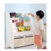 Детски дървен органайзер с трапецовидна форма – тесен в горната част и широк в основата, за максимална стабилност, а стъпаловидният дизайн осигурява добра видимост и лесен достъп. Има четири отворени отделения с различни височини. Децата могат самостоятелно да избират любимите си книги и да ги подреждат след употреба, което развива навици за ред и самостоятелност, в духа на метода Монтесори методологията. Долната част на органайзера е с две текстилни кутии за съхранение за още по-удобно съхранение.Характеристики: