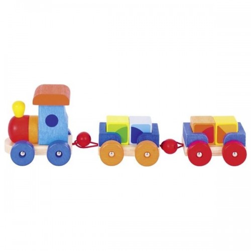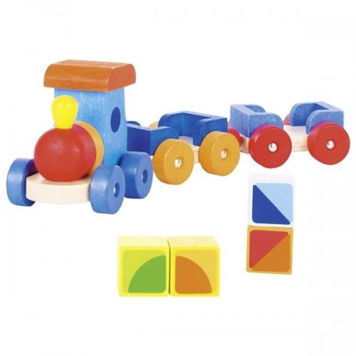 - Комплектът съдържа: 4 цветни кубчета, 1 локомотив, 2 вагона