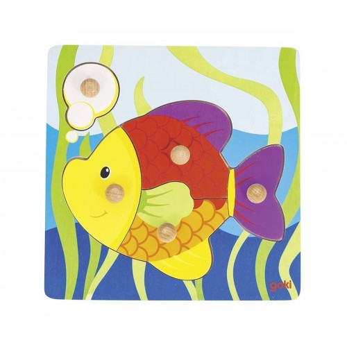 Образователен дървен пъзел с ярки цветове и големи части, подходящ за най-малките деца. За удобство на децата, всяко парче е с дървен накрайник-дръжка за по-лесно наместване на парчетата на пъзела.
