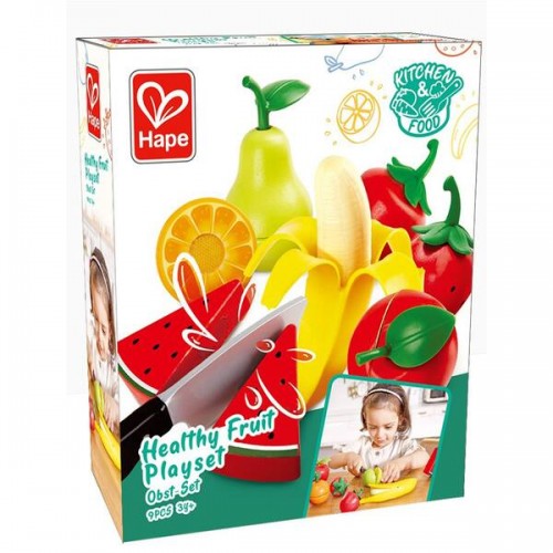 Цветен здравословен комплект, който съдържа 9 части цветни плодове: 2 ягоди, круша, портокал, ябълка с подвижни дръжки, един резен диня и реалистичен нож, с който може да нарежете плодовете.Характеристики: