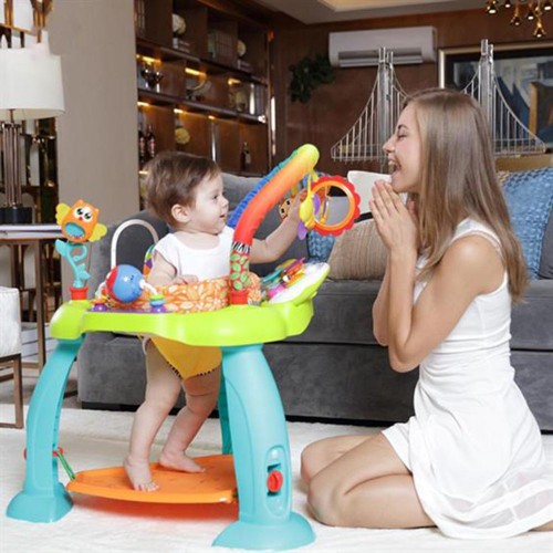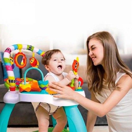 - Има 3 нива за регулиране на височината, а подплатената седалка се завърта на 360 градуса, позволявайки на детето да достигне до всички играчки в центъра