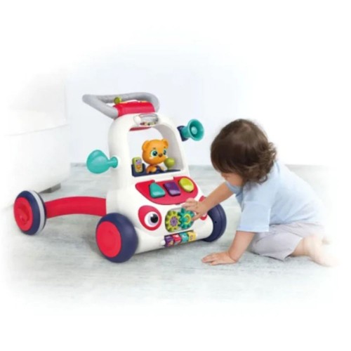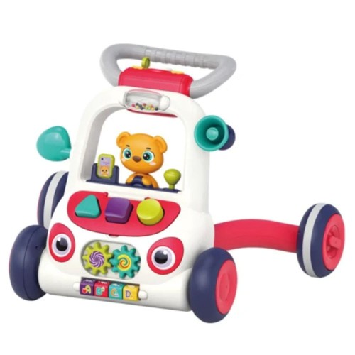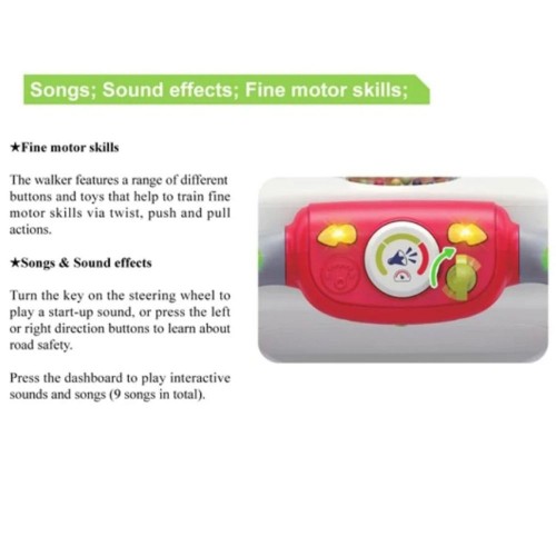 Проходилка, с визията на кола, има пирамидален дизайн, за да бъде стабилна, предлага много интерактивни занимания за детето, има багажник, в който да прибере нещо и издава звуци, на които всички да се радват.
