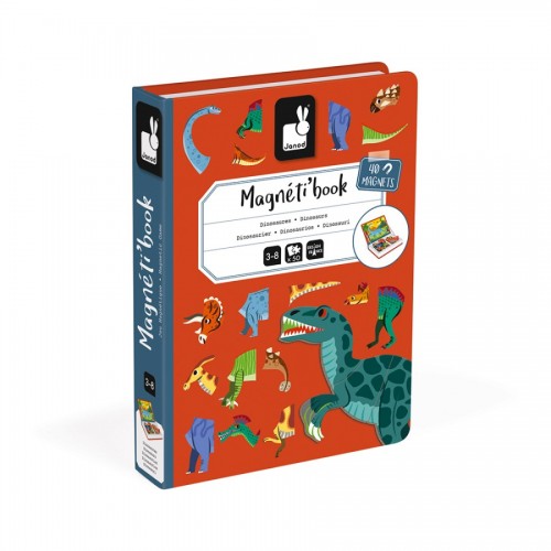 Магнитната книга Динозаври съдържа 40 цветни магнита с елементи на тялото (глави, опашки, лапи и други), необходими за създаване на динозаври и 10 карти с илюстрации на представители на избрани видове от тези праисторически същества, които могат да бъдат моделирани на дъската. Магнитите също ви позволяват да подреждате напълно нови, измислени животни. Това е чудесно забавление за малките любители на праисторическите влечуги, както и за всички творчески настроени деца. Кутията във формата на книга, е изработена от картон и е удобна за носене или съхранение в домашната библиотека.Характеристики: