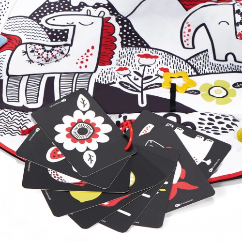 - 4-та зона помага на бебетата да тренират концентрацията си: постелката има специален джоб, където могат да се поставят контрастните карти и огледалце. Тези елементи фокусират вниманието на детето и го учат на концентрация върху конкретно действие