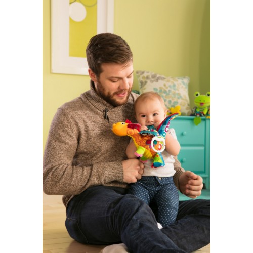 Бебето ще се забавлява с летящото драконче Флин, което маха с крилата си! Издърпайте белият клипс, за да накарате красивите цветни крила да се раздвижат и да замахат нагоре и надолу. Летящият Флин е с пъстри крака и пиукащ нос. Той е направен от меки тъкани от шест различни материала в разнообразни контрастни цветове, така че бебето ви може да ги изследва и да развива сетивата си. Вземете Флин на Lamaze, където и да отивате, като прикрепите халката на бебешката количка, столче за път или към чантата за пелени. Подходящ за бебета още от раждането.