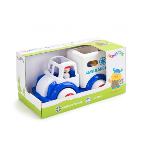 Детска играчка Линейка с две човечета и носилка за "болните".Човечетата могат да се свалят и с тях да се играе самостоятелно. Колата може да се комбинира с други играчки - превозни средства в същия размер (25 cm) и да се закачат едно за друго в обща композиция.Играчките Viking Toys са изработени от безвредна пластмаса, не съдържат дребни части и са изключително лесни за почистване - могат да се почистват в миялна машина.