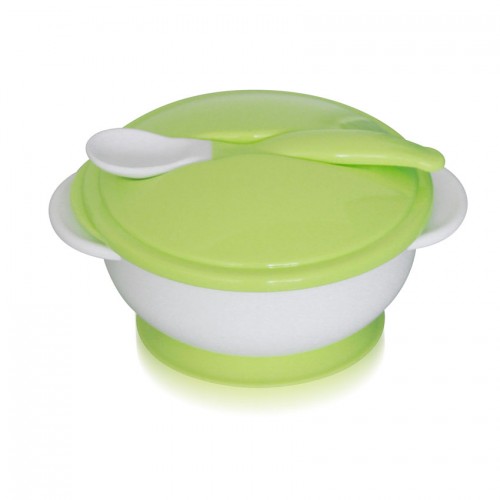 Купа за хранене с капак и вакуумно дъно, което предпазва купичката от обръщане. Капакът затваря много плътно купичката. Лъжичката е изработена от мека пластмаса. На капачето има специално място за поставяне на бебешката лъжичка при пренасяне.