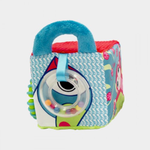 - Има ръкохватка от плат, дрънкалка, която подрънква леко и гъвкав ринг, с който играчката може да се закачи на количка, столче за кола, шезлонг и т.н.