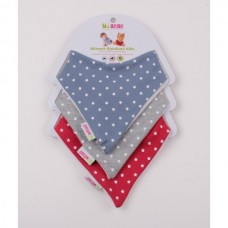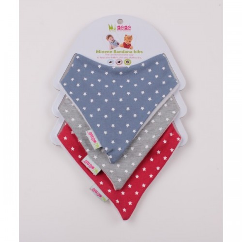 Красив и практичен начин да запазите бебешките дрехи сухи,като същевременно съчетавате лигавника с облеклото на детето. Комплект от 3бр. Минене бандана лигавник в 3 различни цвята с интересни десени на звездички. Лицевата страна на лигавника е изработена от памучно трико, докато хастарът е от мека хавлия, която предотвратява мокренето на бебешките дрешки. Банданата се закопчава с уникална по рода си велкро лепенка, която е с гладка повърхност и не би могла да нарани детето.