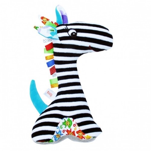 Забавната дрънкалка Жираф ще въодушеви всеки мъник. Разнообразието от цветни етикетчета с различни текстури, скритата дрънкалка и контрастните райета ще провокират желанието за игра, като в същото време ще стимулират фината моторика на бебето.