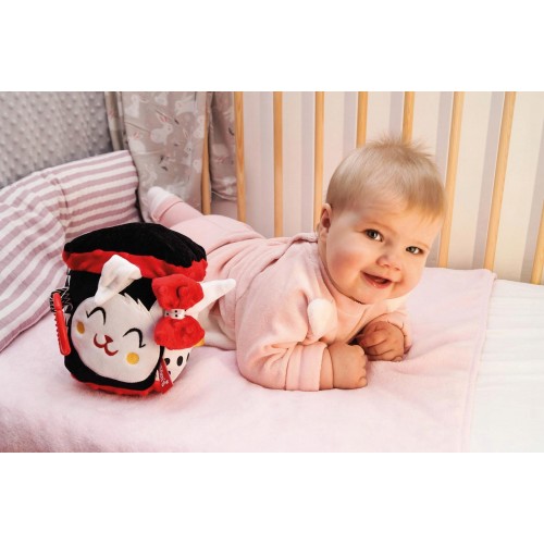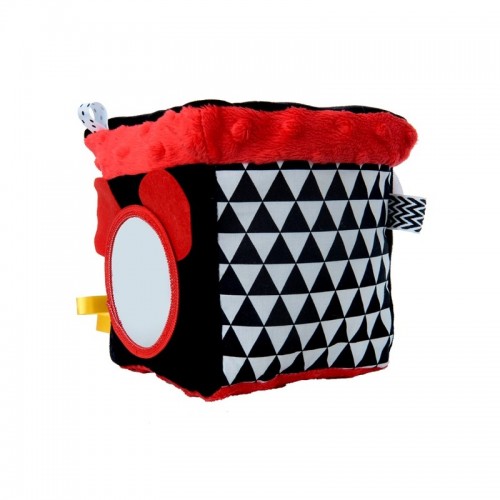 Mom's care Мека играчка Активити Куб. Контрастните цветове, разнообразието от форми, материи и картинки на тази играчка ще стимулират сетивата и ще подпомогнат развитието на фината моторика на Вашето бебче. Кубчето е изработено от висококачествен памук и мек плюшен плат, а в стените му е вложена специална материя, която издава нежен "шумолящ" звук при пипане. Всичко това, комбинирано и с безопасното огледалце, превръща играчката в истинско забавление за малките палавници. А когато бебчето удари една от стените му, Кубчето издава "писукащ" звук. Играчката има и специална халка, с която може да се закача за количка.Характеристики: