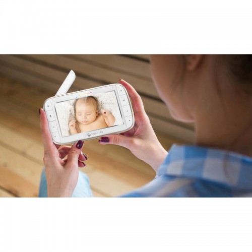 5-инчов портативен видео монитор с Wi-Fi®, с който можете да наблюдавате бебето си и през нощта. Има гъвкава скоба за монтаж на камерата, дистанционно управление, наклон, увеличение и инфрачервено нощно виждане. А чрез приложението Motorola Nursery се активира и HD видео.Характеристики: