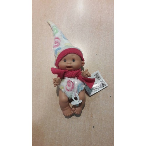 Малка, сладка ухаеща на ванилия кукла бебе. С шарена шапка и пеленка, розово шалче, както и бяла залъгалка. Бебето е с височина 21 см, а тялото е произведено от твърд винил. Крачетата и ръчичките са подвижни. Играчката е подходяща за деца на възраст 3 години +.Nines d'Onil са испанска компания и са в света на куклите от 1986 г. И до днес тя предлага на малките си клиенти най-доброто. Компанията е част от испанската асоциация на играчки производители (AEFJ). Всяка кукла се отличава със своите особености: цвят на дрехата, израз на лицето, цвета на очите и кожата.
