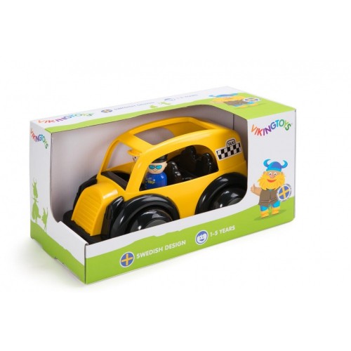 Детска играчка жълто, нюйоркско такси с две човечета.Човечетата могат да се свалят и с тях да се играе самостоятелно. Колата може да се комбинира с други играчки - превозни средства в същия размер (25 cm) и да се закачат едно за друго в обща композиция.Играчките Viking Toys са изработени от безвредна пластмаса, не съдържат дребни части и са изключително лесни за почистване - могат да се почистват в миялна машина.