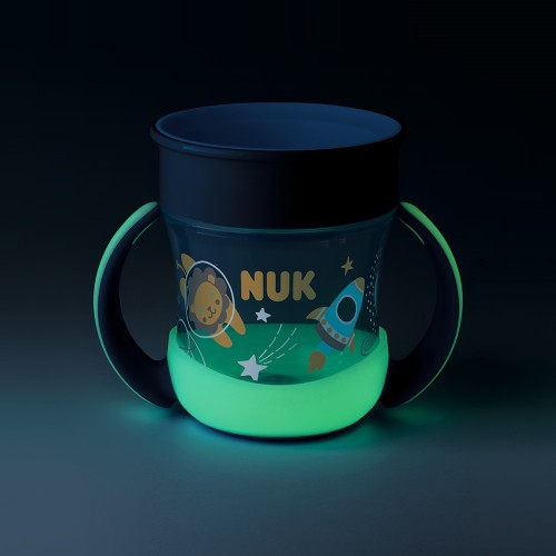 NUK магическа чашка 360 градуса, 160мл, подходяща за деца дан 6 месечна възраст.Благодарение на специалния материал, чашата излъчва мека светлина през нощта и лесно ще я намерите в тъмното.Magic Cup е подходяща за приучаване към самостоятелно пиене, не се разлива и от нея може да се пие от всеки страни.Характеристики: