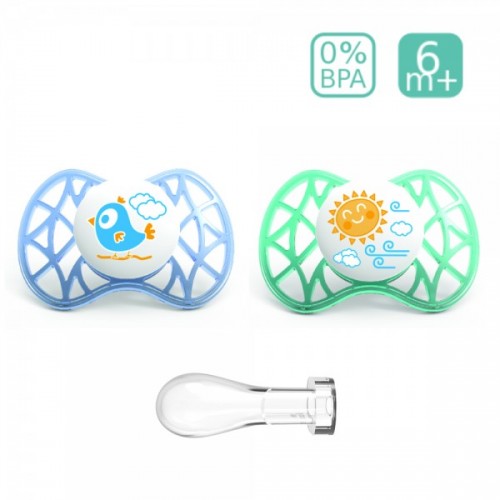 - Биберонът има анатомична форма и не пречи на естественото развитие на небцето. Плочата му пропуска 55% въздух и има дишаща повърхност.