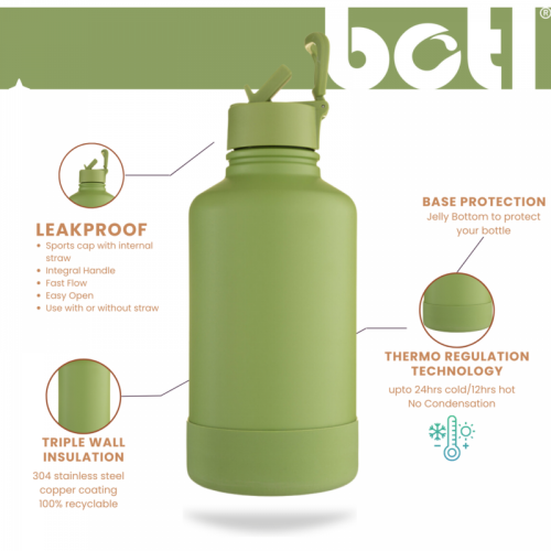Термо бутилка от неръждаема стомана с вакуумна изолация, предназначена да запази напитките ви топли до 12 часа или студени до 24 часа. Има удобна спортна капачка с дръжка и силиконов протектор на основата, който предпазва от удари.Характеристики: