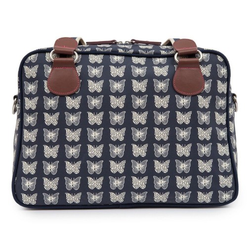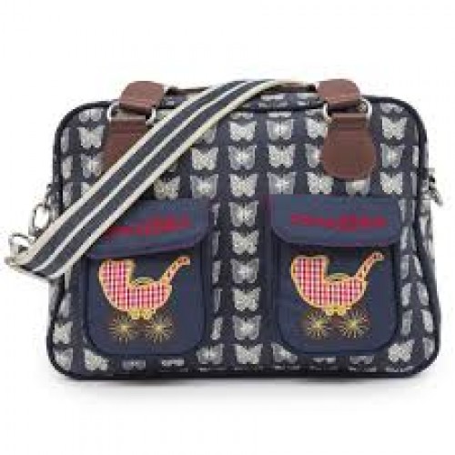 - Тази чанта се отличава отвън с десен с бели пеперуди на тъмно син фон и е „черешката на тортата“ на дизайнерските чанти за смяна на пелени!