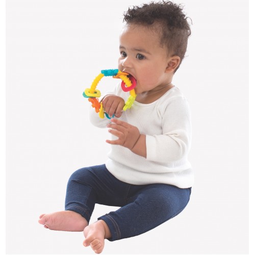 Цветната дрънкалка-гризалка Триъгълник ще забавлява бебето в продължение на часове. Различните по форма елементи привличат вниманието на бебето, а цветните мъниста във вътрешността на играчката издават "дрънкащ" звук при движение.
