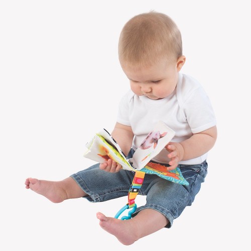 - Книжката е обогатена с различни повърхности и шумолящи звуци, които насърчават бебето да хваща и развиват фината моторика.