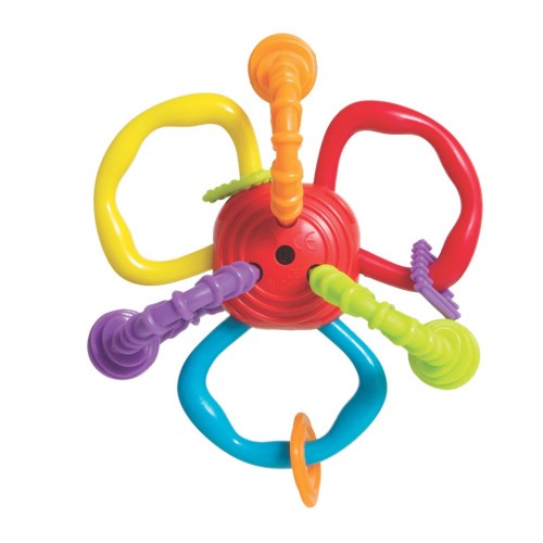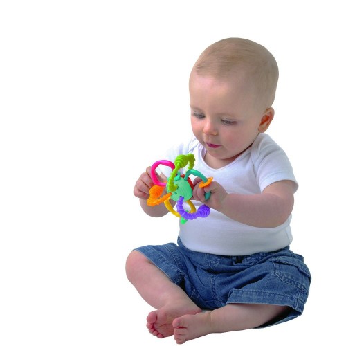Топката има разнообразни форми и части за гризкане, които ще успокоят сърбящите бебешки венци. Дрънкалката издава дрънкащ звук и е в наситени цветове, които стимулират слуховите и визуалните детски възприятия.