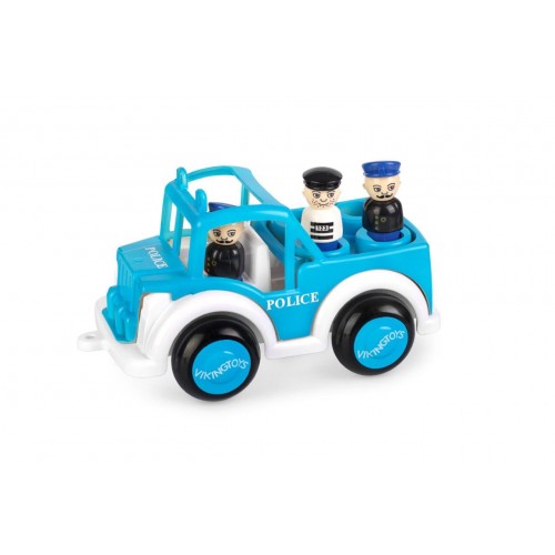 Детска играчка Полицейски джип с три човечета.Човечетата могат да се свалят и с тях да се играе самостоятелно. Колата може да се комбинира с други играчки - превозни средства в същия размер (25 cm) и да се закачат едно за друго в обща композиция.Играчките Viking Toys са изработени от безвредна пластмаса, не съдържат дребни части и са изключително лесни за почистване - могат да се почистват в миялна машина.