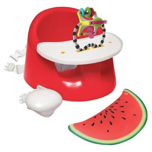 Ръкохватката в средната част на стола може да се махне и на нейно място да се постави табла за хранене, която има подложка с картинка на киви/ диня. Подложката се почиства лесно. В комплектът е включена и играчка, която се поставя на таблата и забавлява бебето.