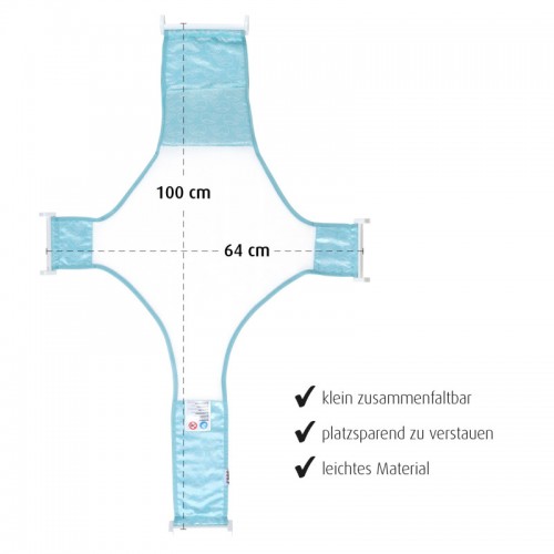 С мрежата за бебешка баня MyHappyBath осигурявате комфортно изживяване при къпане на бебето и също така се чувствате облекчени, когато държите детето си.Повечето бебета се чувстват комфортно във вода. Удобната позиция за къпане позволява на детето да се наслаждава още повече на банята си. Но също така се нуждаете от стабилна позиция, за да можете да дадете на детето си необходимата опора във ваната.Характеристики: