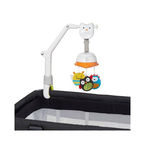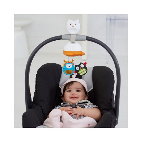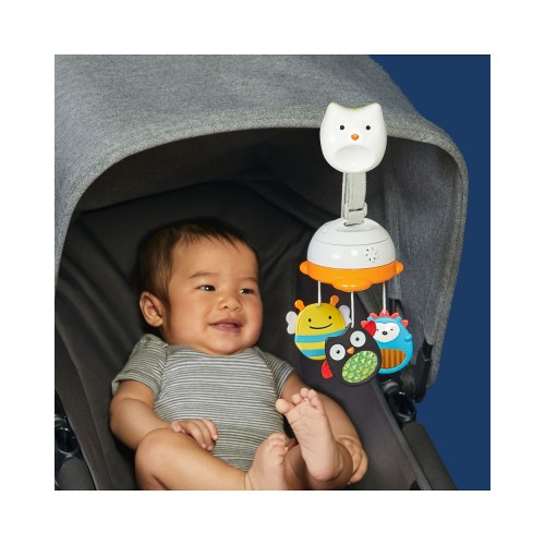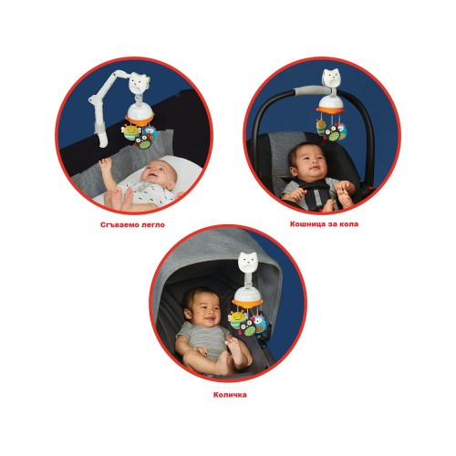 Музикалната въртележка насърчава разпознаването на цветове и звуци и умението за хващане. Може да се закача за колички (с клипс), столчета за кола (с каишка) и сгъваеми креватчета (със скоби).