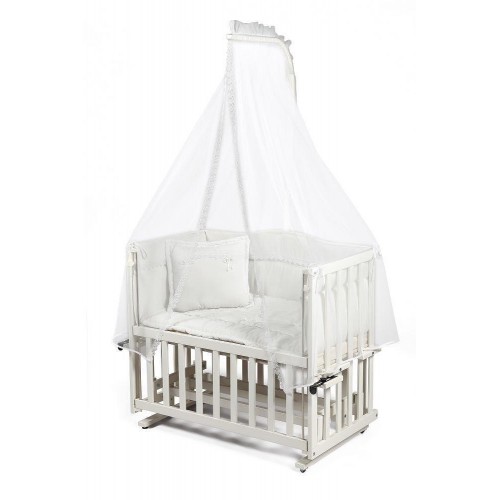 Бебешко легло - люлка, изработено от 100% варен бук, с включени текстилни части: чаршаф, олекотена завивка, възглавница, обиколник, балдахин и матрак от луксозни памучни тъкани.