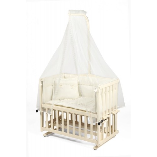 Бебешко легло - люлка, изработено от 100 % варен бук, с включени текстилни части: чаршаф, олекотена завивка, възглавница, обиколник, балдахин и матрак от луксозни памучни тъкани. С красив дизайн за по-уютна детска стая.