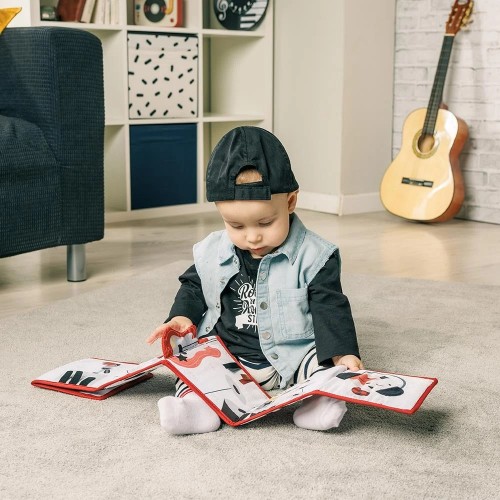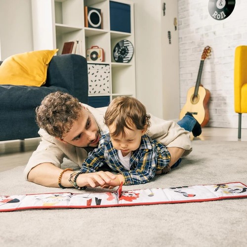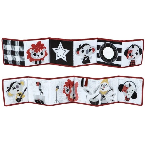 Двустранната книжка-обиколник от колекцията Tiny Rockers ще събуди любопитството на бебето, подпомагайки неговото развитие. Книжката има 7 увлекателни дейности и двустранен дизайн, подходящ за различните етапи на растеж. Едната страна е с по-изчистен дизайн с контрастни форми, които стимулират зрението на най-малките бебета. А забавните рокендрол герои с игриви текстури имат за цел да се удължи времето, прекарано по корем и укрепването на мускулите на по-големите бебета.Характеристики: