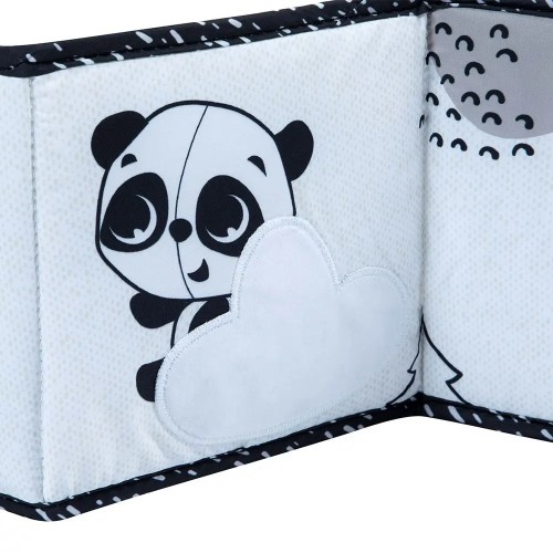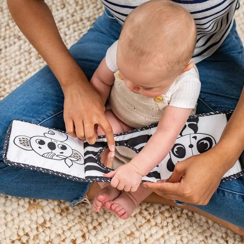 Двустранната книжка-обиколник Double-sided First Book е изпълнена с множество активности, важни за развитието на детето – безопасно огледало, контрастни черно-бели картинки , елементи „повдигни и намери“, шумолящи части, елементи с различни на допир текстури, сатенени лентички.