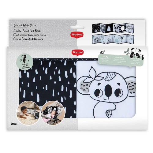 Меката двустранна книжка от Tiny Love удължава времето по корем и развива различни сетива и умения у детето.Двустранната книжка-обиколник Double-sided First Book е изпълнена с множество активности, важни за развитието на детето – безопасно огледало, контрастни черно-бели картинки , елементи „повдигни и намери“, шумолящи части, елементи с различни на допир текстури, сатенени лентички.