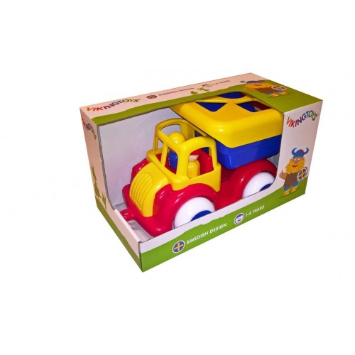 Детска играчка Товарен камион - сортер с две човечета. Играчката има отвори за сортиране на формички.Човечетата могат да се свалят и с тях да се играе самостоятелно. Може да се комбинира с други играчки - превозни средства в същия размер (25 cm) и да се закачат едно за друго в обща композиция.Играчките Viking Toys са изработени от безвредна пластмаса, не съдържат дребни части и са изключително лесни за почистване - могат да се почистват в миялна машина.