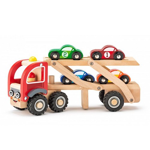 Дървено камионче, което превозва състезателни коли, с което детето ви ще може да играе. Дайте възможност на малките пакостници да превозят своите коли до пистата в детската стая и там да се състезват.Характеристики: