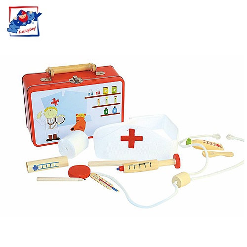 - В него има сестринска касинка, лекарски слушалки (стетоскоп), термометър, спринцовка, бинт, лепенки, рецептурник, както и играчки-лекарства.