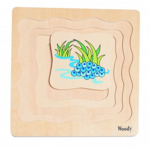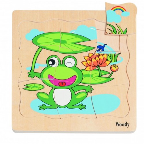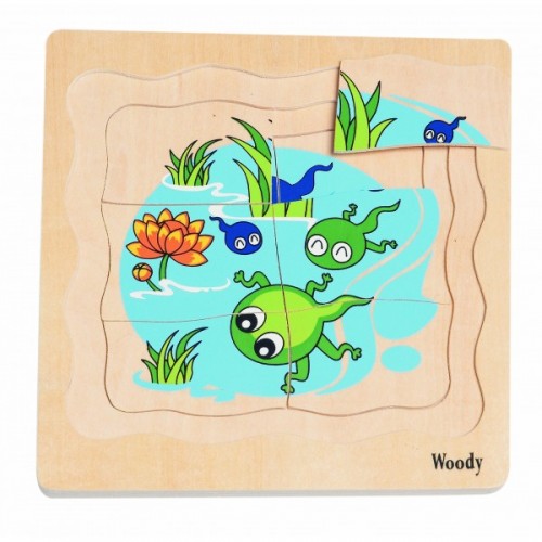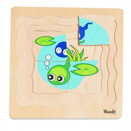 Детската дървена играчка многослоен пъзел "Развитие на жабката" на Woody има 20 елемента.